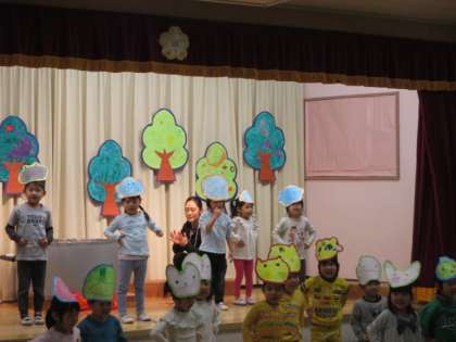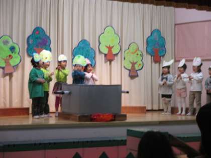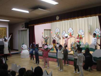 年少組の子ども会がありました。うさぎ組は「おいしいスープできたかな」、りす組は「まいごのノンタン」の劇をしました。動物のお面を自分で作り、動物になりきってのびのび表現することを楽しみました。初めての子ども会にドキドキでしたが、保護者の方がたくさん見に来てくださり、大喜びの子どもたちでした。
