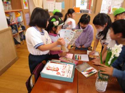 年長児が給田小学校を訪問し、小学校1年生に学校を案内してもらったり、遊んでもらったりして交流をしました。一年生に優しくされ、小学校の様子を知り、小学校への期待が高まりました。