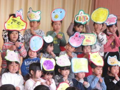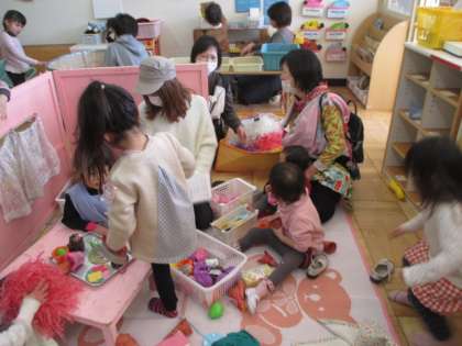 年少児と来年度の新入園児がままごとや電車ごっこ、ぬりえなどをして一緒に遊びました。『ゆげの朝』の歌や『トントンひげじいさん』の手遊びを披露したり、手作りの動物のお面もプレゼントしたりしました。4月になったらまた会えるのが楽しみですね!