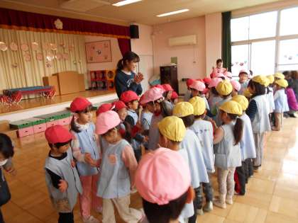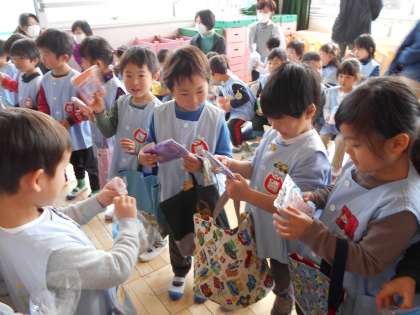 年少児は年長児への感謝とお別れの思いを込めて『おわかれかいの歌』や言葉を披露し、年長児は『みんなともだち』の歌を披露しました。また、思いを込めて一生懸命作ったプレゼントを交換しました。年少組は紙粘土のペン立て、年長組は絞り染めの弁当包みを作りました。「今までありがとう」と言葉を添えて渡す姿や、嬉しそうにもらったプレゼントを見つめる姿がありました。最後は皆で「さよならみなさん」のフォークダンスを楽しみました。子ども同士のつながりが深まり、とてもあたたかな雰囲気に包まれたお別れ会となりました。