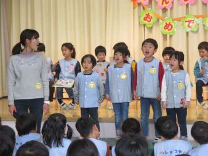 今年度最後の誕生会をしました。年少うさぎ組が初めての司会をしました。お辞儀の仕方や言葉などを優しく教えてもらった年長たけ組の幼児に見守られながら、自信をもって司会ができました。お楽しみではペア学級で「ラウンドチェーン」をしました。