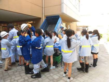 他にも「カティ」という体験学習用ごみ収集車を見学、操作体験したり、実際に現場でしようされている安全靴やリサイクルで出来ている作業服を着させていただきました。