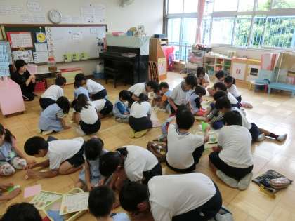 ・雨の中、5年生が幼稚園に行って交流を図りました。一緒に楽しそうに折り紙で作品を作っていました。