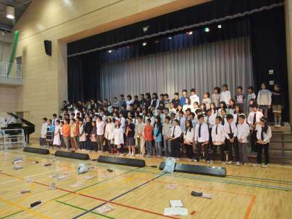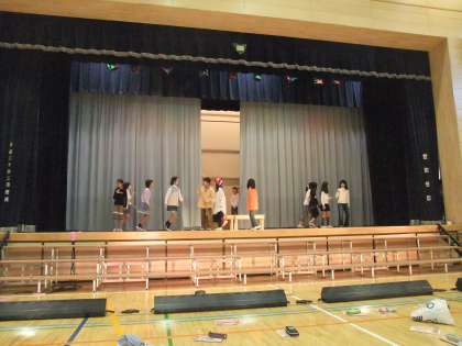 5年生の、一週間前の練習風景です。体育館での2時間連続練習では、全体を通して演技、楽器の確認をしました。エピローグの全員合唱は気持ちよく歌っていました。