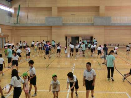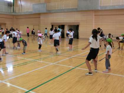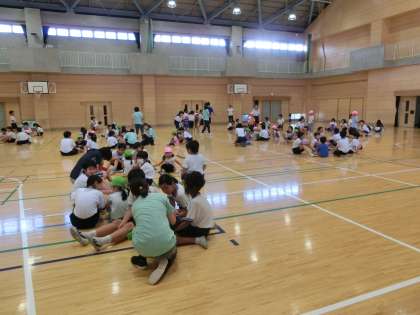 本校の体育館で、5年生が幼稚園の園児にソーラン節を教えました。園児は秋の運動会で演技するので、一生懸命5年生に教わっていました。