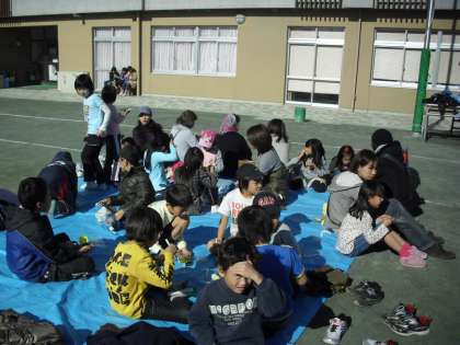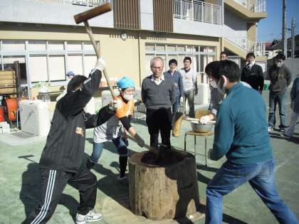 千歳民俗資料保存会主催、遊び場開放共催のもちつき会が行われました。昨日から地域・PTAの方々にお手伝いいただき、今日は約500人の子ども・保護者・地域の方々におもちが配られました。給田地域伝統の「かけづき」が披露され、4本のきねの軽快な音と掛け声に、見ている人から歓声があがりました。晴天のもとで食べるつきたてのおもちに、みんな大満足でした。