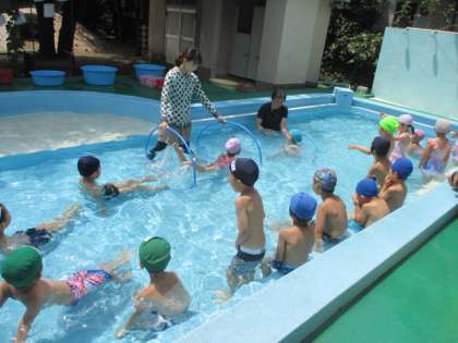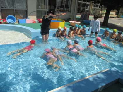 7月11日(水) 森田先生による元気アップタイム(プール指導) 公開日 2018/08/17 更新日 2018/08/17 給田幼稚園 日本女子体育大学准教授、森田陽子先生のご指導のもと、年長児がプールで「元気アップタイム」を行いました。水を掬って顔に付けたり、ワニ泳ぎをしたり、水の中でウルトラマンポーズをしたり、楽しみながら水に慣れ親しんだり浮く感覚を経験したりすることができました。 いいね(0)