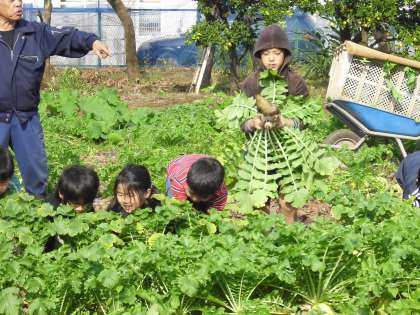 ご主人の杉田さんにたくさんの質問に答えていただいた後、大根を収穫する体験もしました。1本抜くのも大変だった様子の子供たちは、嬉しそうに大根を抱えて学校に帰ってきました。