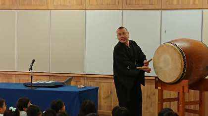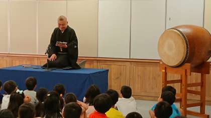 四年生は落語家の方による落語教室を行っています。太鼓の叩き方や着物についてお話しいただいたあと、落語を聞きました。楽しい学習です。