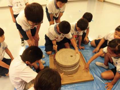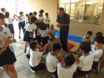 4年生で9月の20日に社会の体験学習をしました。わらじをはいてみたり、わらを編んでみたり、石臼をひいたりしました。普段できない体験やお話を聞くことができ、とても有意義な時間を過ごすことができました。
