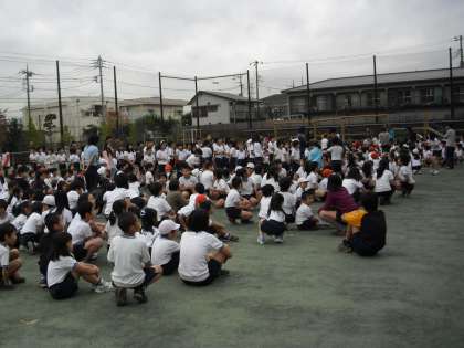 たてわり活動の班ごとに1〜6年生までが混じって並び、伝言ゲームを行いました。