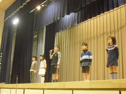 今日はいよいよ2学期の最終日です。終業式では2年生の代表5人が「2学期にがんばったこと」を発表しました。学芸会に漢字、水泳に九九に縄跳び。みんな本当に一生懸命がんばりました。3学期も、自分や友達のよいところをどんどん見つけ、たくさん学び、楽しく過ごせるといいですね。それでは、よいお年を!