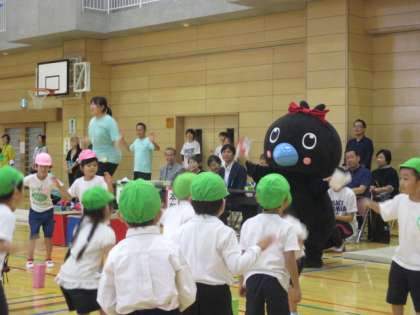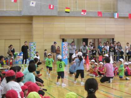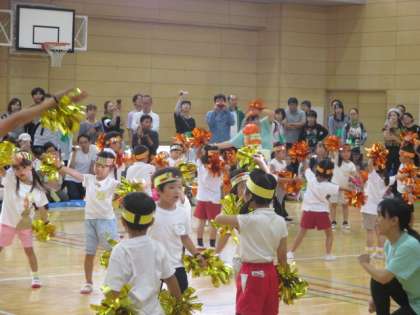 あいにくの雨で、給田小学校体育館での開催になりました。50周年記念に「始めのからぴょん体操」で、なんとからぴょんが来てくれました!キラキラのポンポンを持って元気に踊った年少さん、力いっぱいリレーを走った年長さん、どの競技にも全力で取り組むみんながとてもかっこよかったです。