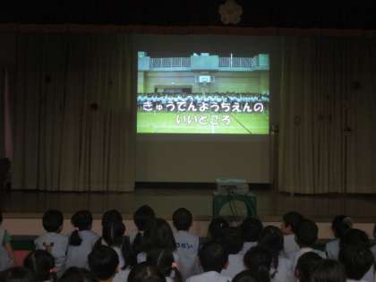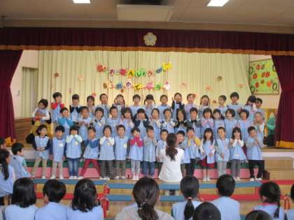 11月12日(月) 誕生会 公開日 2018/11/29 更新日 2018/11/29 給田幼稚園 11月生まれの友達を皆でお祝いしました。司会は年長もも組。お楽しみは年少組が「やきいもグーチーパー」の手遊びと「まつぼっくり」の歌を披露しました。年少児は初めての発表でしたが、自信をもって歌い、たくさんの拍手をもらって嬉しそうな表情でした。また、幼稚園50周年を祝して給田小4年生によるお祝いDVDや、周年委員さんによるDVDを皆で鑑賞しました。 いいね(0)