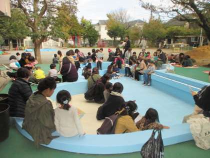 親子で幼稚園の好きな場所で絵本を読みました。子どもたちは保護者の方と一緒に秋の気持ちのよい気候の中、テラスやプールサイドでゆったりとお気に入りの絵本を読んでもらっていました。
