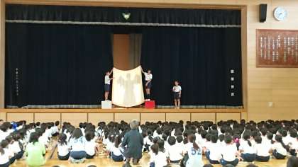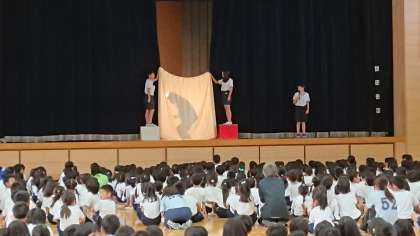 今日は先生方のシルエットクイズを行いました。先生方が工夫して、フラフープを回していたり、仮装をしていたり、子供たちも楽しく見ていました。給田小学校にはたくさんの教職員がいます。みんな覚えたかな。