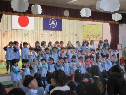 入園式では年長児が歓迎の言葉と歌を披露しました。今日から始まる一年間、楽しいことがいっぱいありますように!