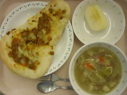 大人気のナンとカレーを組み合わせたナンピザカレー。大きめのナンでボリュームたっぷり。キャベツやたまねぎ、にんじん、じゃがいもが入った野菜スープとともに、おいしくいただきました。