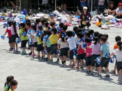 1年生の表現は、「ぴかぴかビリーブ!」でした。カラフルなTシャツを着て、キラキラのポンポンを振りながら踊る姿は、とてもかわいらしかったです。