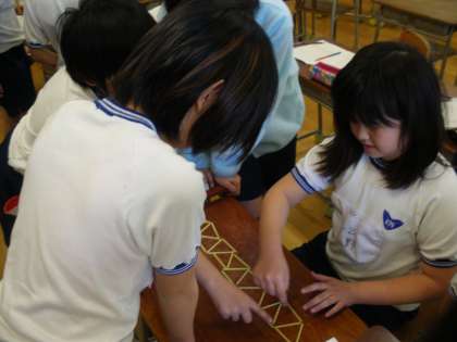 4年生の算数では、ともなって変わる量の学習をしています。楽しそうに手を動かしながら、三角形の数とストローの本数の関係に気付くことができました。
