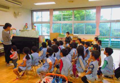 各クラスの絵本サポーターの保護者による絵本タイムがありました。絵本の読み聞かせ、手遊び、エプロンシアターなどに、園児たちはじっくりと見入っていました。保護者の皆様、大雨の中をありがとうございました!次回の絵本タイムも楽しみです。