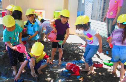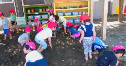 5月23日(木)・24日(金)<裸足で砂遊び> 公開日 2019/06/04 更新日 2019/06/04 給田幼稚園 初夏のような2日間、年少児がクラスごとに砂場で全員裸足になって遊びました。足を埋めたり山を作ったり、水を運んで流したりと夢中で遊び、遊具の片付けや手足の洗い方、汚れた衣服の着替えなどのやり方も学びました。今後も砂や水の感触を思い切り味わい、たくさんの発見や試行錯誤、友達との協力などを経験してほしいと思います。 いいね(0)
