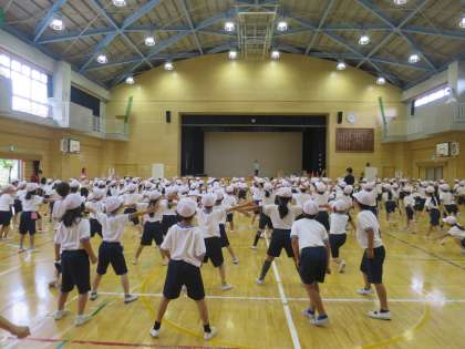 1・2年生は体育館で、3年生は校庭で朝から元気に体を動かしました。