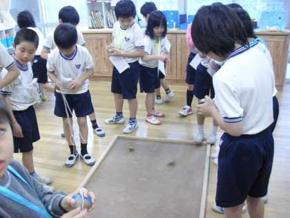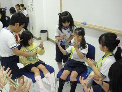 1年生が2年生のお兄さんお姉さんと昔あそびをしました。こま回し、あやとり、竹とんぼ、まりつき、折り紙、だるまおとし等、2年生が遊び方を優しく教えてくれました。みんなで楽しく遊びました。