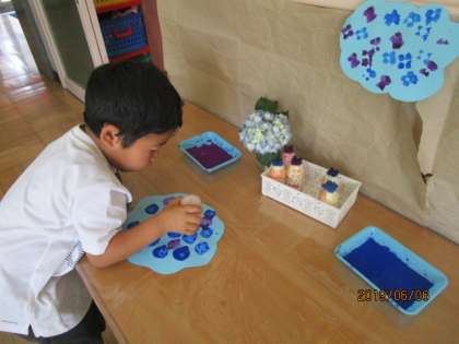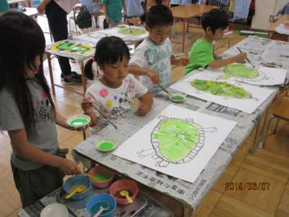 年少は筆でぬたくりやローラー転がし、スタンピングのアジサイ作りで、絵の具遊び。年長は飼育しているカメのスケッチに、自分で混色した絵の具を塗る作品作り。同じ絵の具という画材でも、学年や経験によって色々な楽しさを味わっています。
