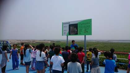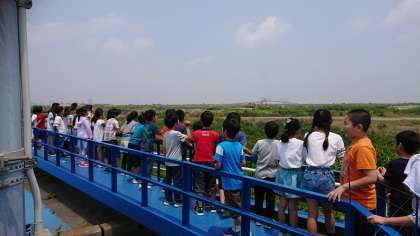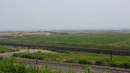 中央防波堤の見張らし広場に上がりました。一面のごみの山です。山に向かって「ごみ、へらすぞ!」をしました。