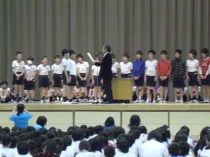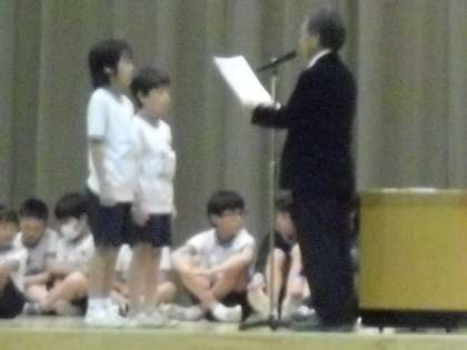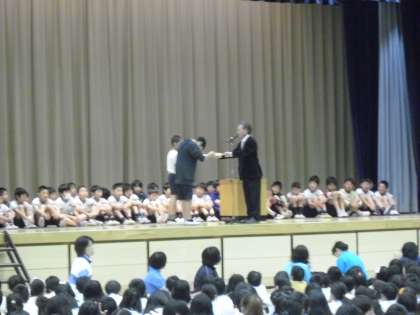今朝の全校朝会で、地域のクラブなどで活躍した