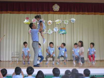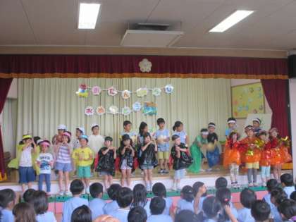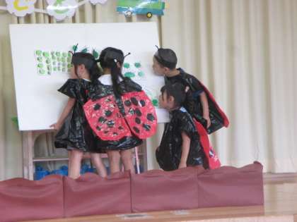 6月の誕生会は、7人の友達をお祝いしました。お楽しみはもも組の劇「カレーパーティーをしよう」でした。種芋を植え育て、収穫したジャガイモでカレーパーティーをするまでのお話で、チョウやテントウムシ、太陽、肉や野菜を売るお店の人たちが登場する楽しい劇でした。のびのびと演じたもも組さんに、拍手!
