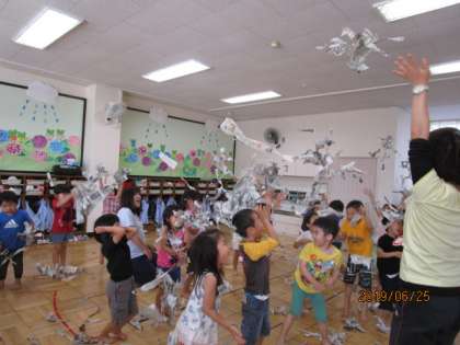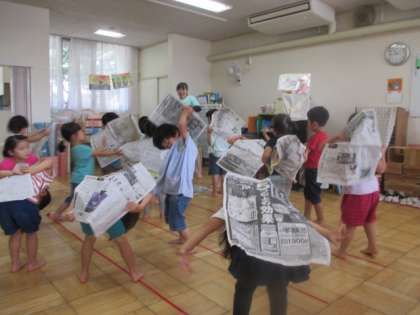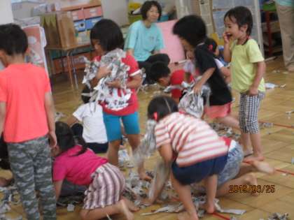 身近にある新聞紙が、魅力的な素材に変身!!くしゃくしゃに揉んだり、被ってみたり、ちぎったり、かき集めたり、投げたりと、体をたくさん動かして力いっぱい遊び、心躍るひと時となりました。思い切り遊んだ後のお片付けもあっという間でした。
