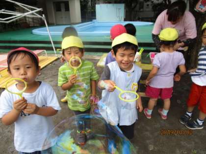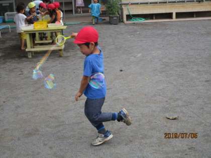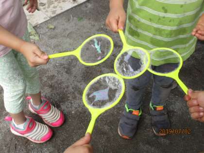 曇って湿度が高いこんな日は、シャボン玉が割れにくく、虹のような色がとてもきれい!ポイ(金魚をすくう道具)に張ったシャボン玉液の膜に息を吹きかけ膨らむ様子を楽しんだり、友達とポイに張った液を移し合ってみたり、長細いシャボン玉作りに挑戦したりと、夢中で遊びました。「不思議だな」「もう一回やってみよう」「今度は違うやり方を試してみようかな」遊びながら芽生える化学する芽、梅雨時の貴重な体験になりました。