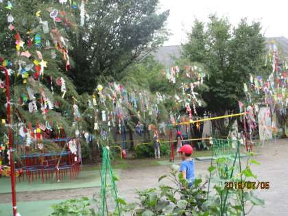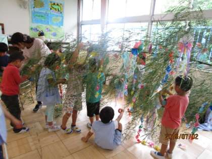7月5日(金)<たなばた飾り> 公開日 2019/07/05 更新日 2019/07/05 給田幼稚園 7月7日は、七夕。幼稚園でもクラスごとに、大きな笹いっぱいに飾りをつけました。年少組は糊やクレパスを使い三角つなぎや野菜などの飾り作りを楽しみ、年長組はじゃばら折りのくす玉やちょうちんなど少し工程が多い飾りにチャレンジしました。年少組はモールをねじって、年長組はこよりを結んで自分で笹につけました。色とりどりの飾りが風に揺れ、見事です。短冊に書いたみんなの願い、星に届くといいですね★ いいね(0)