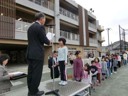 平成22年度の修了式が行われました。各クラスの代表者が校長先生から修了証を受け取りました。名前を呼ばれて「はい。」と、どの子も元気よく返事をしていました。