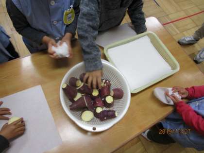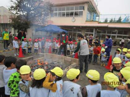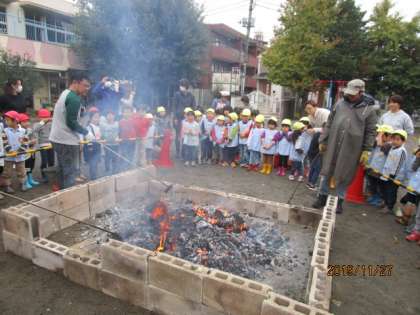 園庭で焼き芋会をしました。園児が焼き芋を包み、火の中に投げ入れ、お手伝いのお父さん達が焼いてくださいました。間近で見る赤々とした炎、肌に感じる熱さ、薪や芋が焼ける匂い、そして最後はねっとりとした甘い芋の味。いろいろな感覚で様々なことを感じた焼き芋会でした。熱い思いをして、お手伝いくださったお父さん方、ありがとうございました。