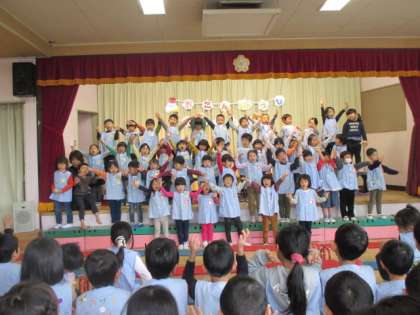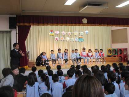 12月7日(木) <誕生会> 公開日 2020/01/16 更新日 2020/01/16 給田幼稚園 12月の誕生会は、10名のお友達をお祝いしました。お楽しみは、年少組の歌と手遊びの発表でした。初めてホールの舞台に並び、ドキドキしながら「やきいもグーチーパー」「みどりのもり」の手遊び、「たべものれっしゃ」の歌を披露しました。入退場やお辞儀も上手に出来ました。 いいね(0)