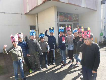 幼小交流として、5年生のクラスから2名ずつ豆まきの鬼役として幼稚園にいきました。