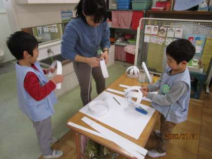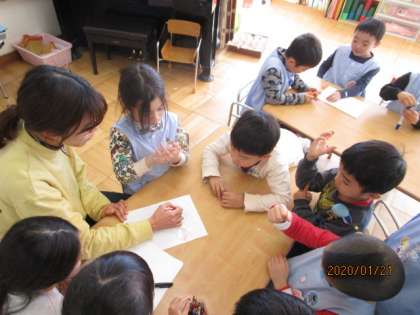 2月の子ども会に向け、各学年で取組が始まっています。年長組は、皆で話の流れやせりふの相談、役決めやお面、小道具作りなど、目的に向かって力を合わせています。年少組は、簡単な話を元にクラス全員で「お話ごっこ」をし、その中でいろいろな動物に変身して動く楽しさを味わっています。