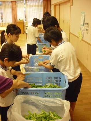 今日の給食は、今が旬のグリンピースごはん。朝から給食委員会の皆さんがグリンピースのさやむきをしてくれました。な、なんと、給田小学校の食数は、約880食です!かごいっぱいに入ったグリンピースのさやを一生懸命むいてくれました。最高でひとつのさやから11個の豆がでてきました。これには、みんなびっくり☆旬の味を楽しみました。