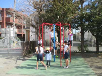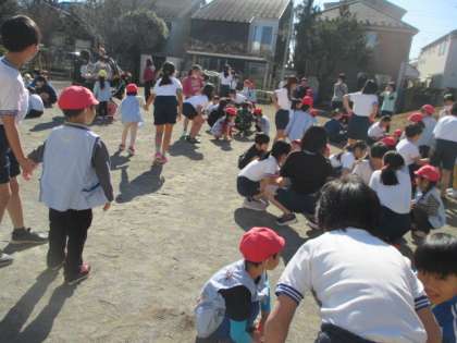 幼稚園に4年生が来てくれて、ペアになり、固定遊具や砂遊び、へびジャンケンや追いかけっこ、ボール投げやサッカー、縄跳びなど色々な遊びを一緒に楽しみました。お兄さんお姉さんがとても優しく接してくれ、どの子も嬉しそうに甘えていました。4年生に親しみを感じ、来年度のソーラン交流につながる機会となりました。4年生の皆さん、ありがとうございました。
