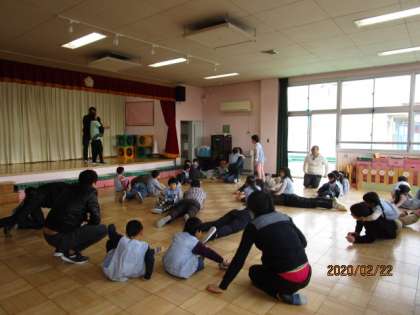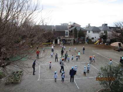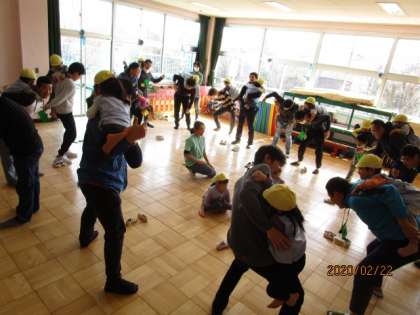 今年度2回目にして最後の「お父さんと遊ぼう会」が行われました。砂遊びやこま回しなど日頃の遊びを一緒に楽しみました。年少組はホールでゲームや触れ合い運動遊び、年長組は園庭でドッジボールなどクラスの皆で楽しい活動をしました。たくさんのお父さんと触れ合い、仲良しになり、甘えていた子どもたち。お父さん達のパワーと優しさをたくさん感じていました。最後に各担任との懇談会では、お父さん達の大きくて温かい眼差しを感じました。お忙しい中、お父さん達お疲れさまでした!