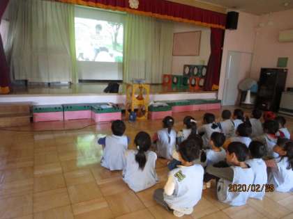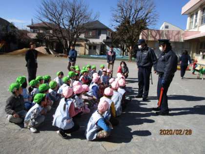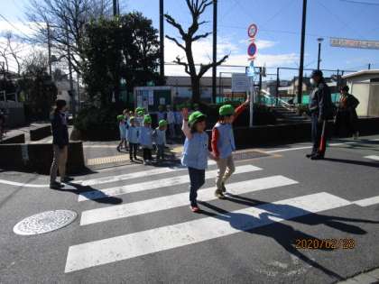保護者の方と一緒に登降園していた年長児も、4月からは一人で登下校をします。そこで安全への意識を高めるため、「危険回避プログラム」を行いました。成城警察署の警察官に話を聞いた後、実際に2人組で左右をよく見て、手を高く上げ、横断歩道を渡ってみました。その後ホールでDVDを見て、公園やエレベーターでの安全な過ごし方、危険を感じたら大声を出すことなどを勉強しました。成城警察署の皆様、ありがとうございました。