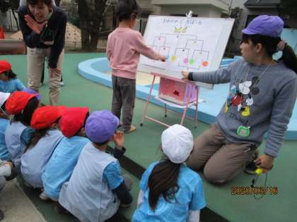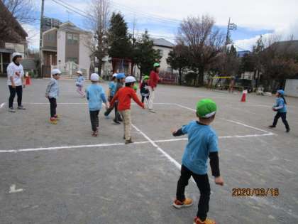 たくさん遊んだ園庭で、年長児と職員が混合チームを作り、トーナメント式でドッジボール大会をしました。チームのメンバーはくじ引きで決めました。2年間たくさん遊んだ園庭で、友達と一緒に力いっぱいボールを追いました。