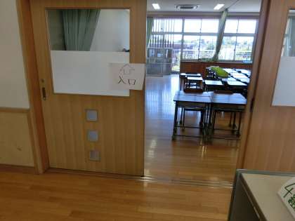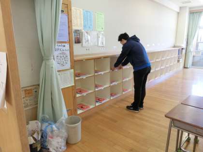 ・教室の後ろのとびらから、入ります。自分のロッカーから、配布物をとりましょう。