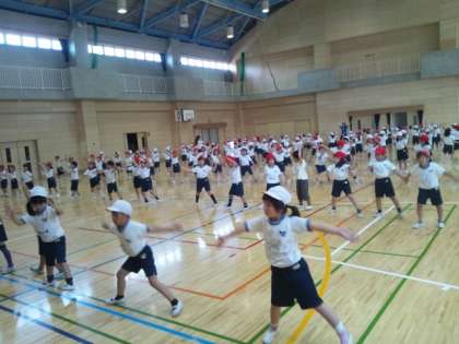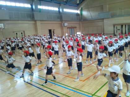1年生の表現は「Qーden キッズ、明日にジャンプ!」。子どもたちの大好きなアニメの曲に合わせて踊ります。踊りは1組の植田先生と4組の網本先生が中心になって考えたオリジナルです。