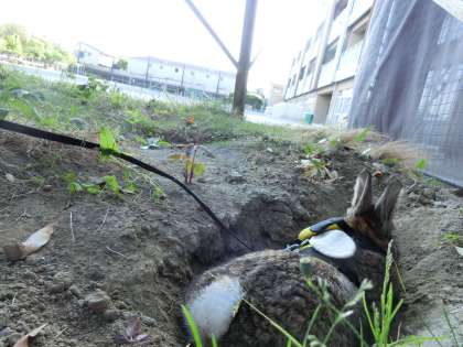 誰もいない校庭を眺める後姿が少し寂しそうです。