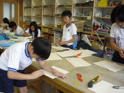 “箱の中は夢の国”を夢中で製作中。ベニヤ板と小割を主に使い、箱の形をつくります。箱の中には憧れの国や、現実の国、夢の国…を表現します。今日は、板を切って、表したい国の風景を絵の具で描きました。