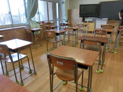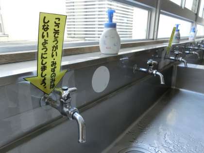 児童が使用する水道は、1つおきに使用できるよう表示を作成しました。